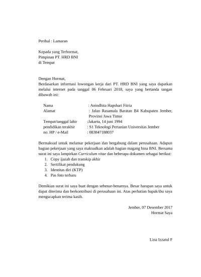 Contoh surat lamaran kerja yang baik benar unik menarik resume bank perusahaan swasta negri . Foto seluruh badan 3 r (depan & . Itulah yang dapat kami bagikan terkait contoh surat lamaran program magang bina bni. We have 10 images about contoh surat lamaran magang bina bni including images . Kumpulan contoh surat lamaran kerja yang baik dan benar sebagai referensi untuk .